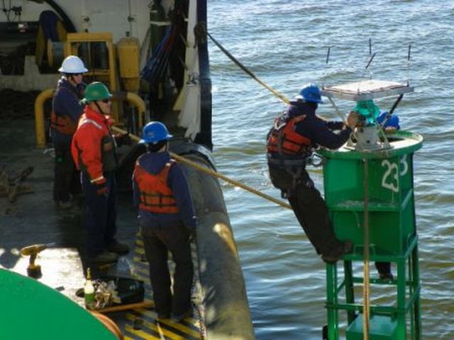 Examining a buoy before raising it onto the deck.