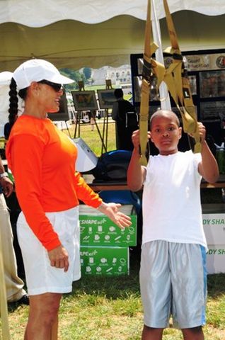 Marianne Lachance, US Coast Guard Headquarters MWR Coordinator spots Khalil Warren, a 9 year old from Washington DC, during his Fitness Challenge on Friday, 17 June 2011 at the Coast Guard Pavilion.